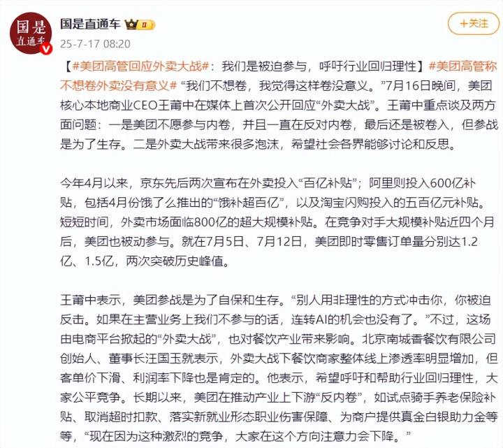 7月16日,据中新社国事直通车,7月16日晚间,美团核心本地商业CEO王莆中在媒体上首次公开回应“外卖大战”。