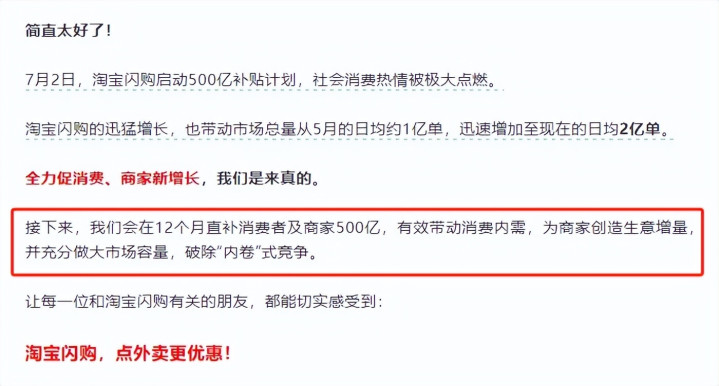 淘宝闪购表示:“接下来,我们会在12个月直补消费者及商家500亿,有效带动消费内需,为商家创造生意增量,并充分做大市场容量,破除‘内卷’式竞争。”